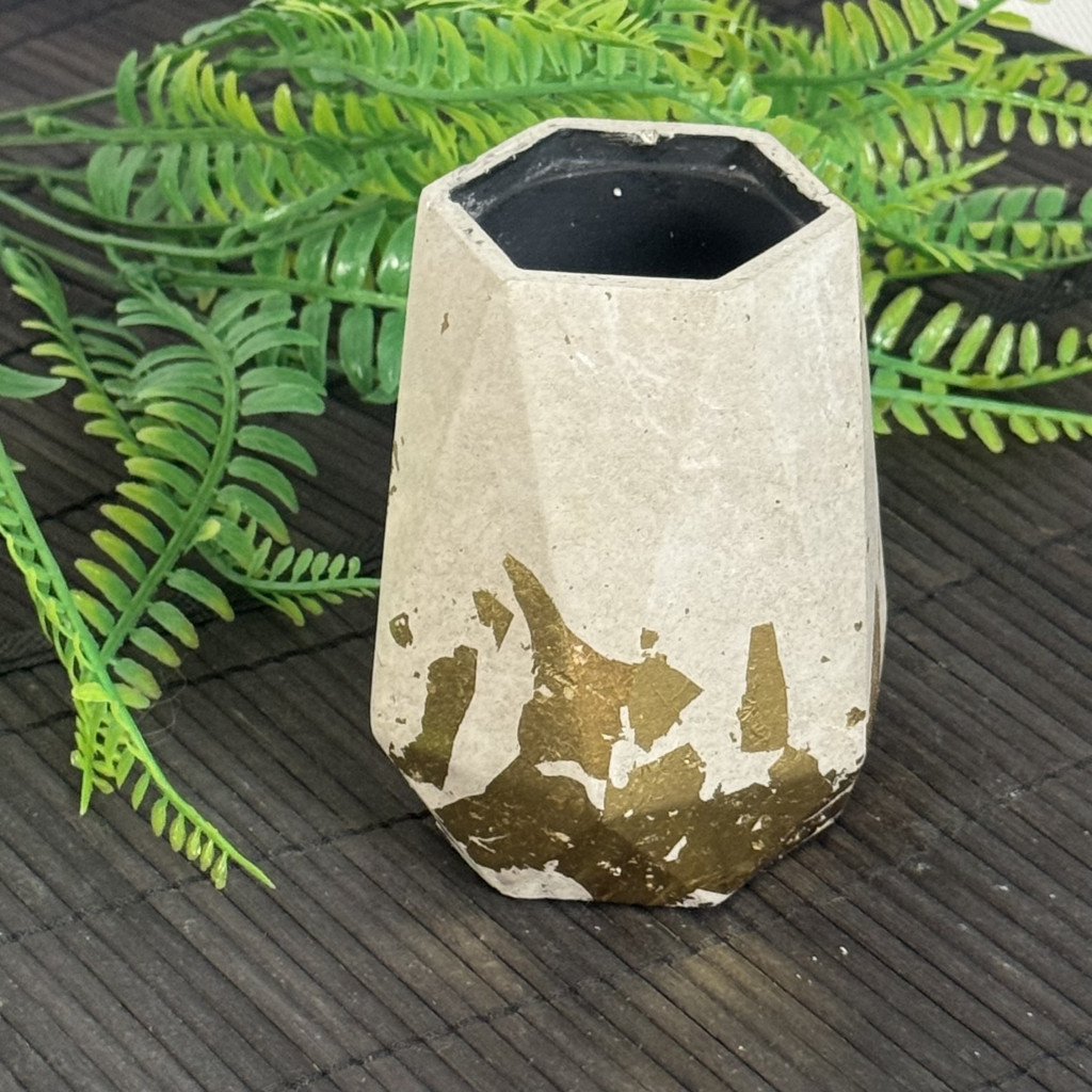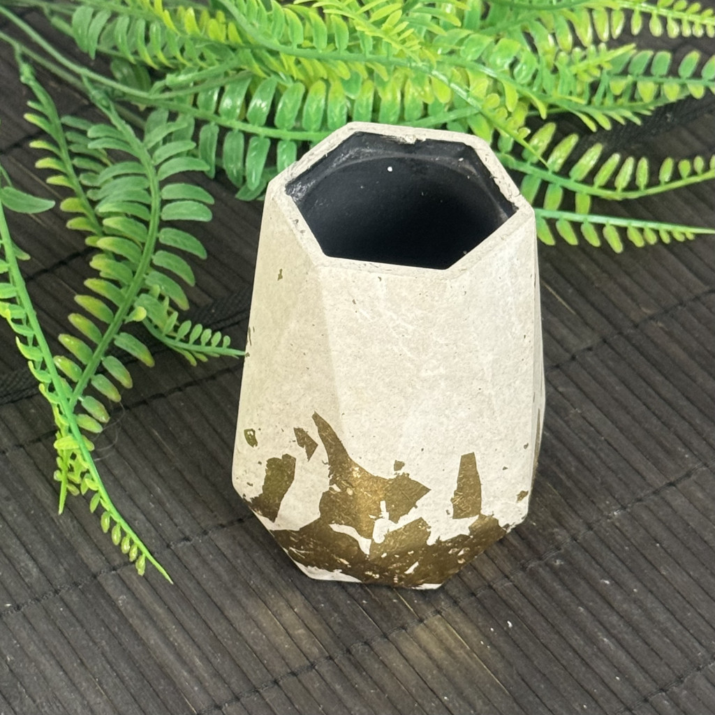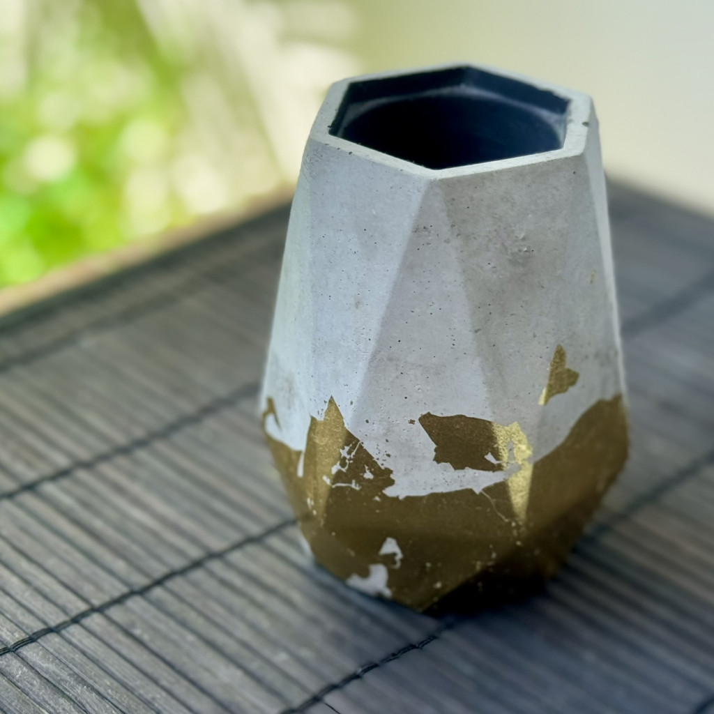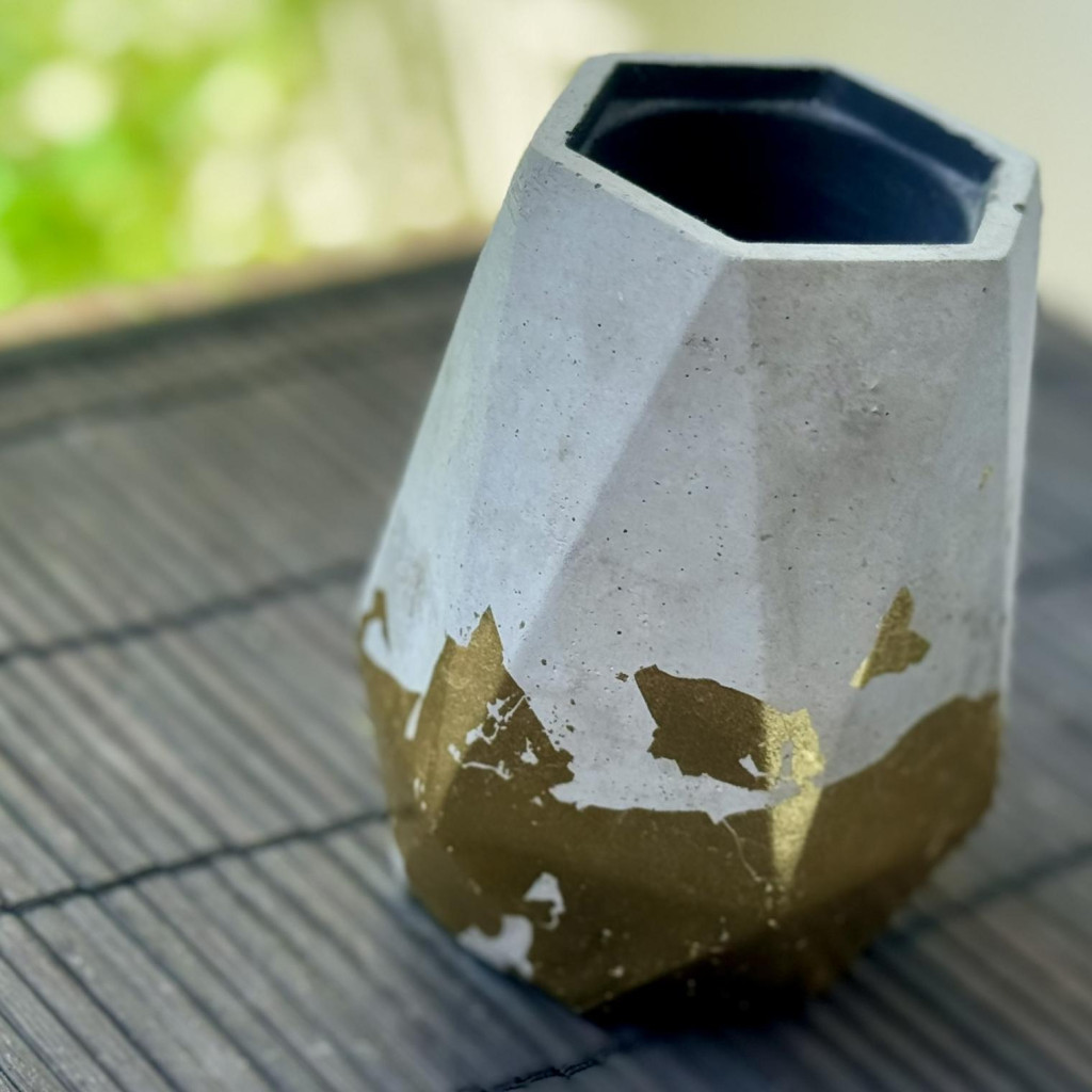 Anyaga beton, külseje natúr beton aranyfóliával részlegesen bevonva, belseje feketére festett. A termék alja karcgátló anyaggal van ellátva.