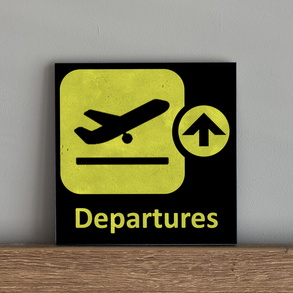 Anyaga beton, felületén "Departures" szöveg és ehhez tartozó klasszikus terminál szimbólumos nyomattal. A termék háta karcgátlóval ellátott.