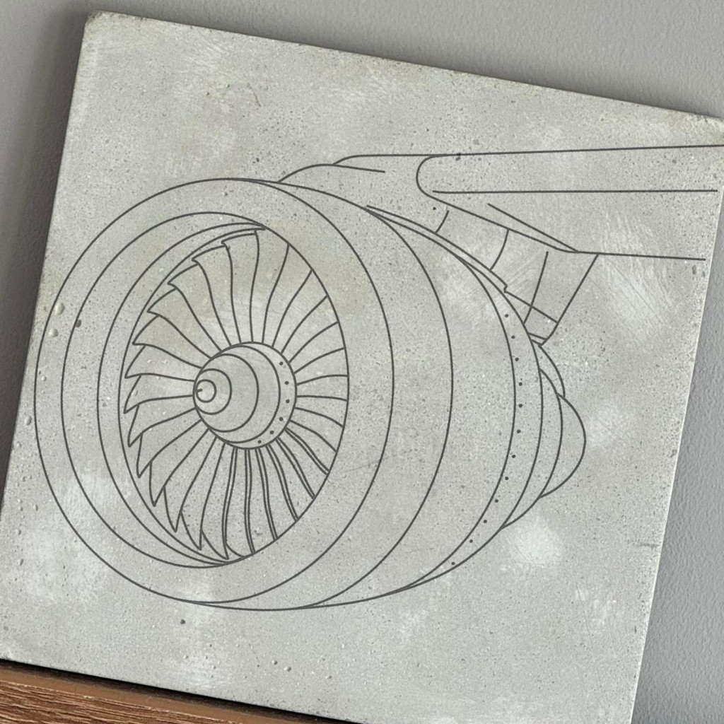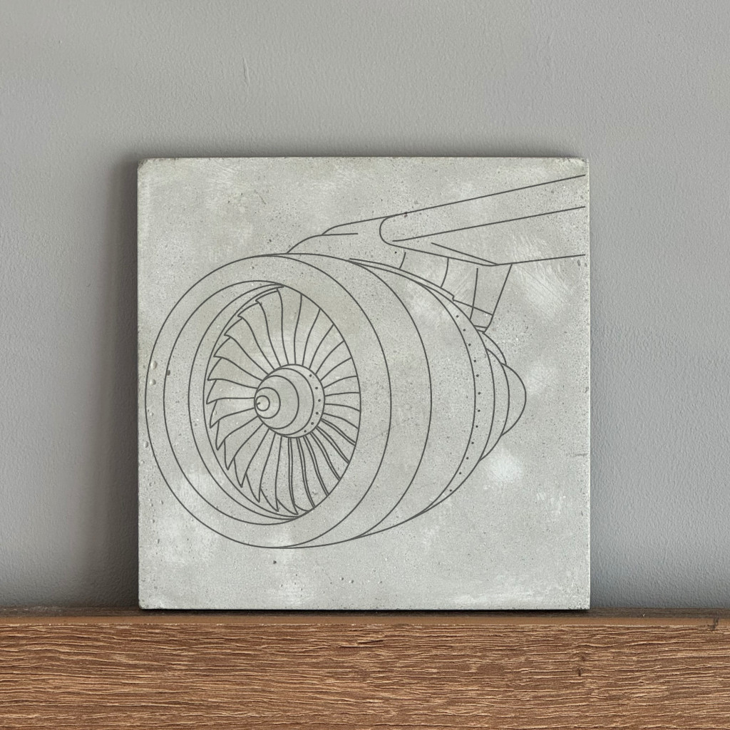 Anyaga beton, felületén repülőgép turbina mintájú nyomattal. A termékek háta karcgátlóval ellátott.