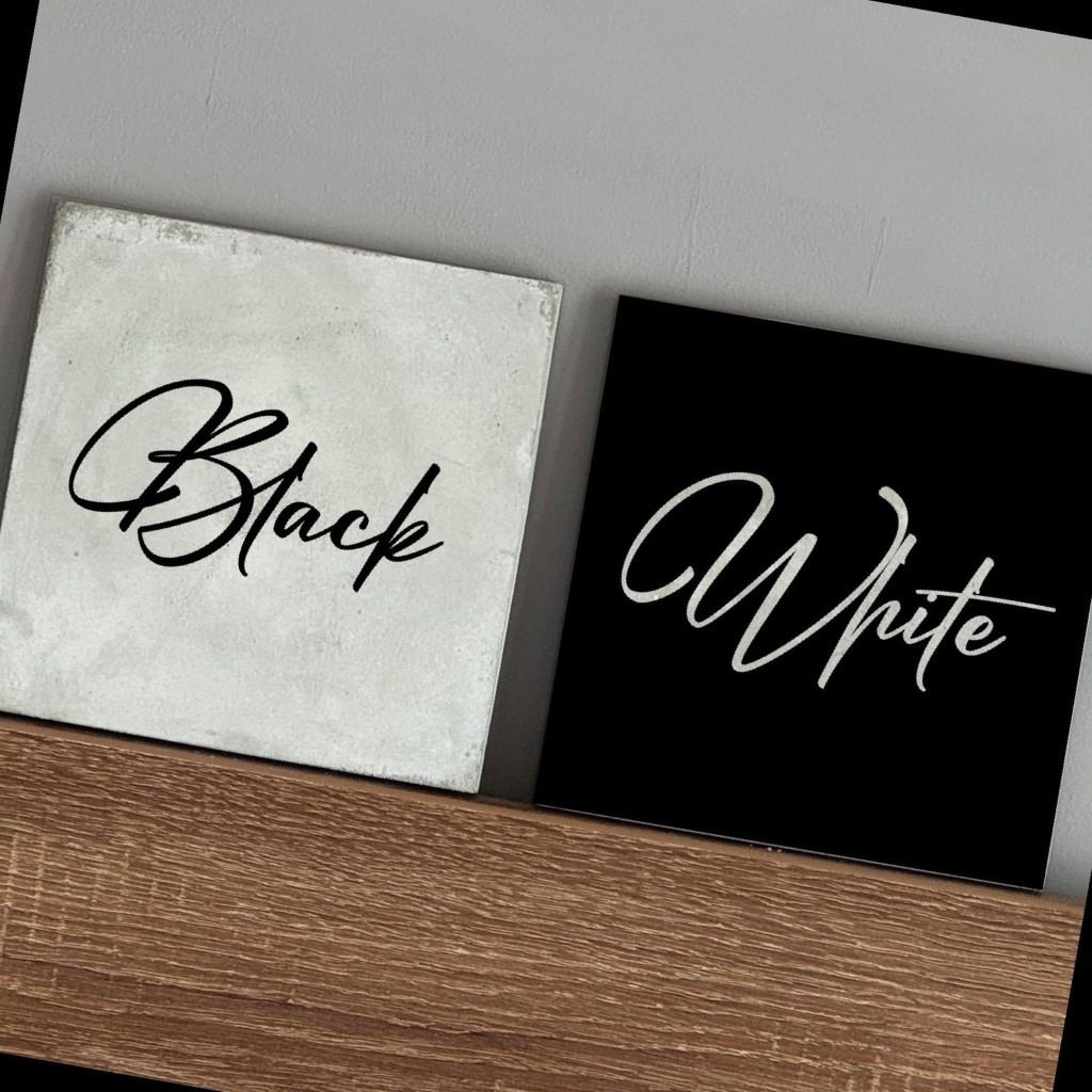 Anyaguk beton, felületükön "Black", "White" nyomatokkal. A termékek háta karcgátlóval ellátott.