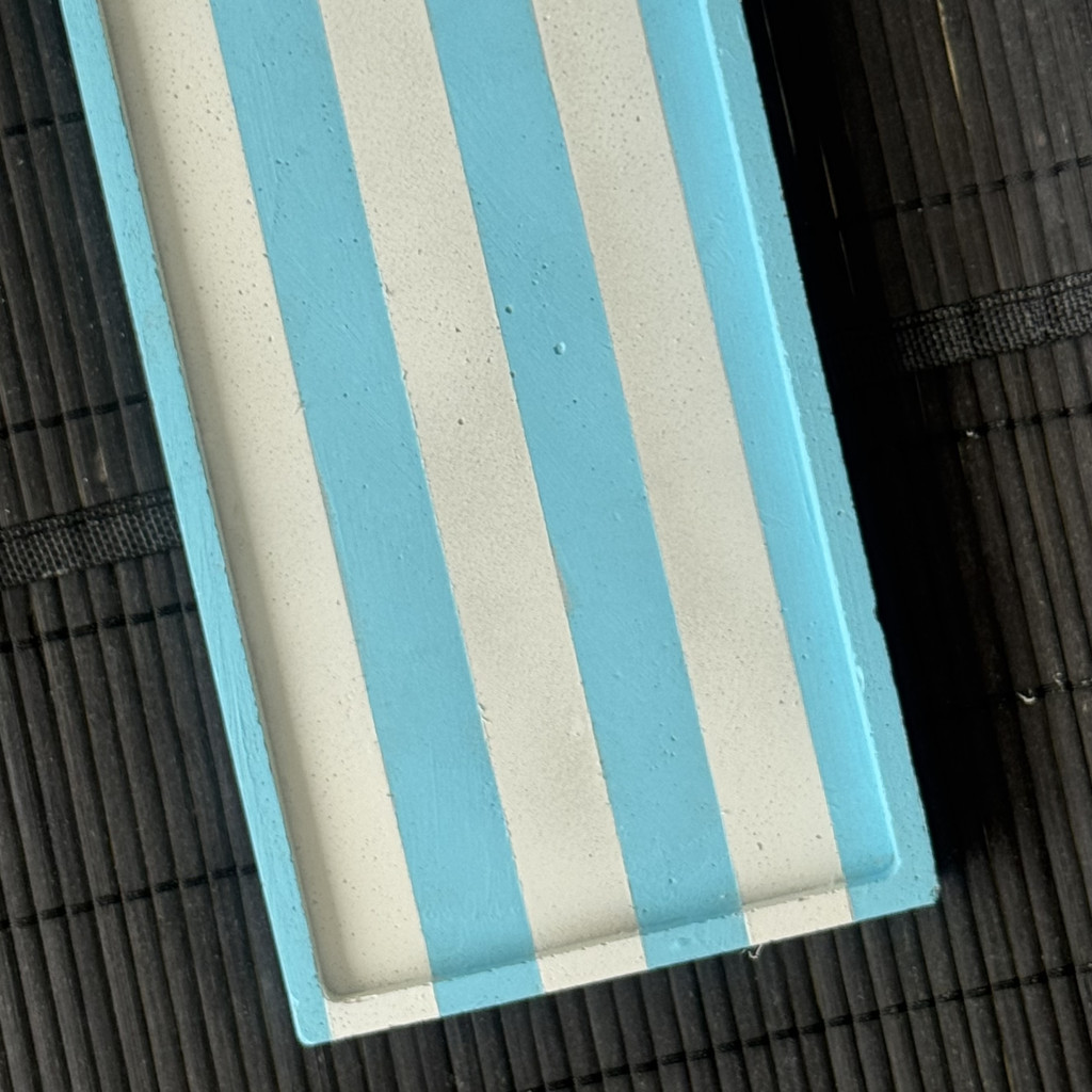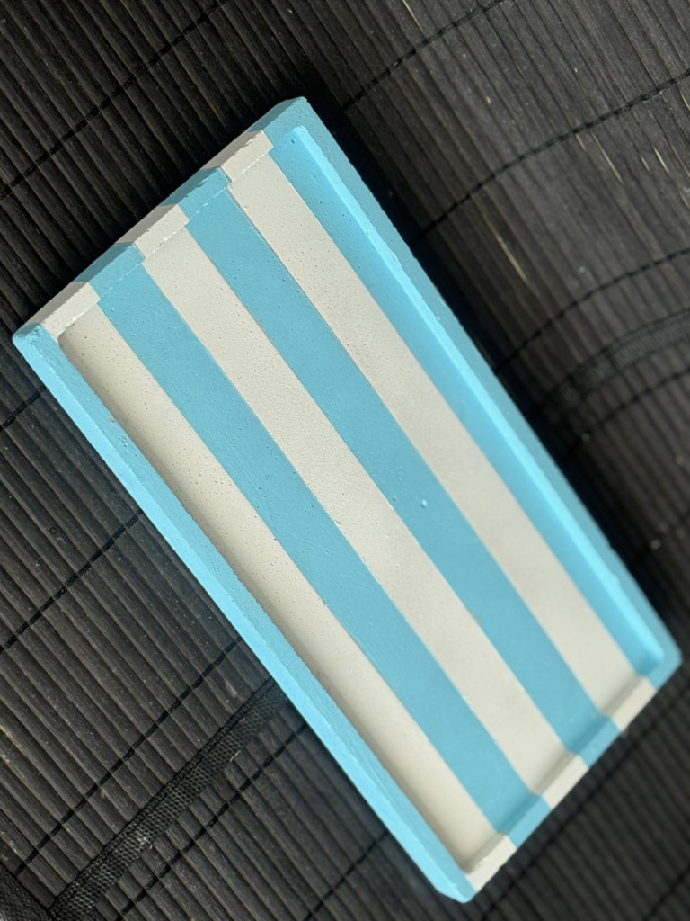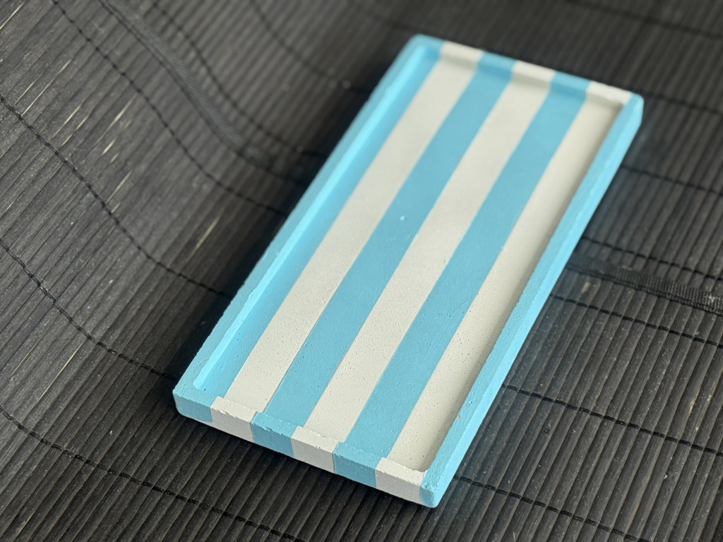 Anyaga beton, színe fehér és égszínkék, csíkozott mintázattal. A termék alja karcgátlóval ellátott.