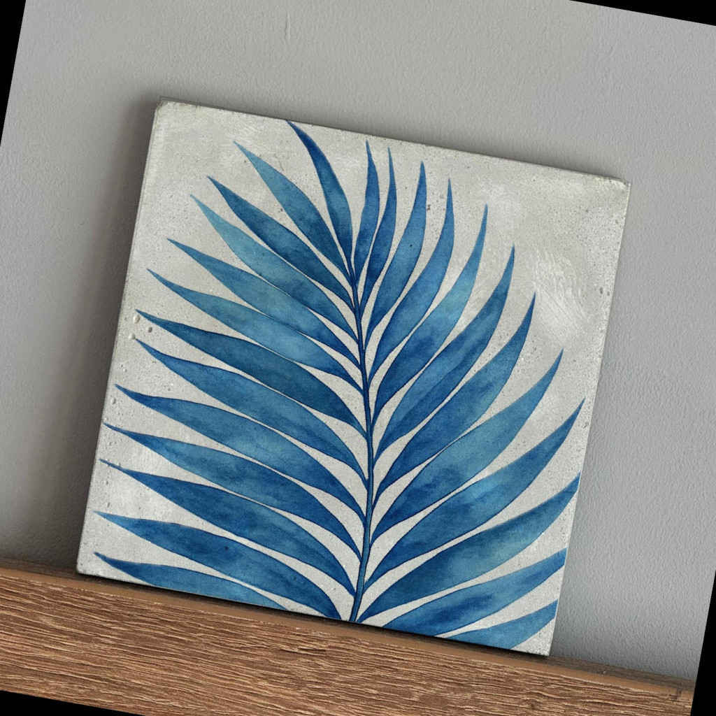 Anyaga beton, felületén kék pálmalevél mintájú nyomattal. A termék háta karcgátlóval ellátott.