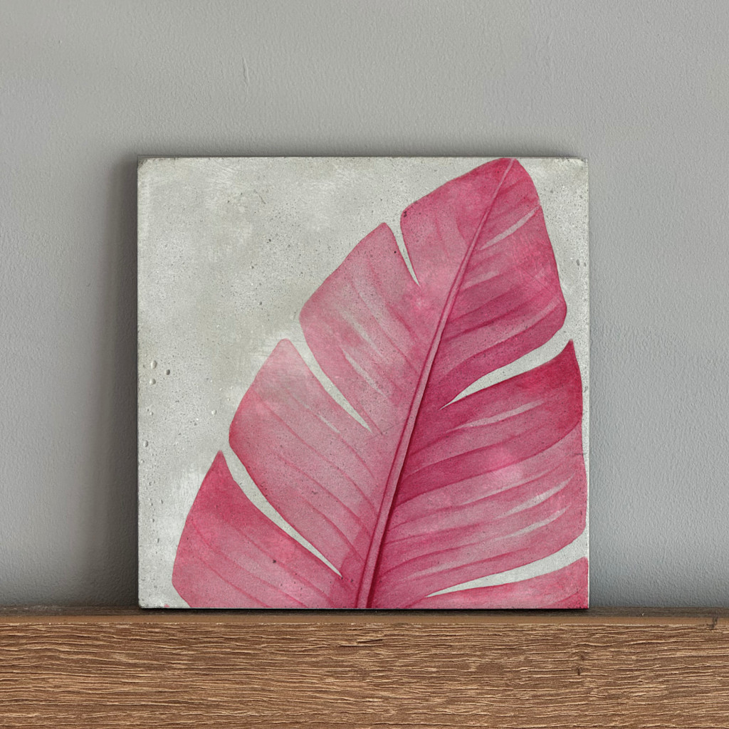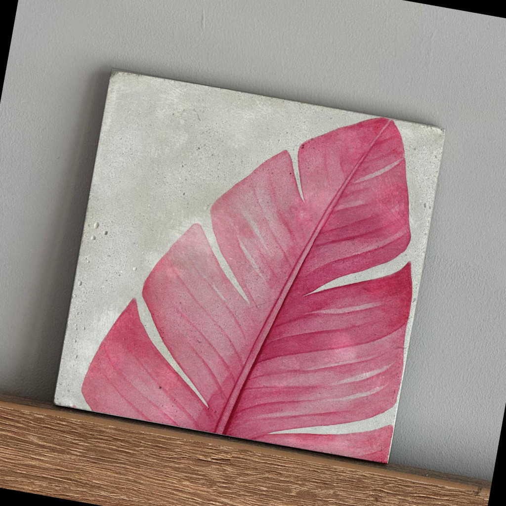 Anyaga beton, felületén magenta színű banánlevél mintájú nyomattal. A termék háta karcgátlóval ellátott.