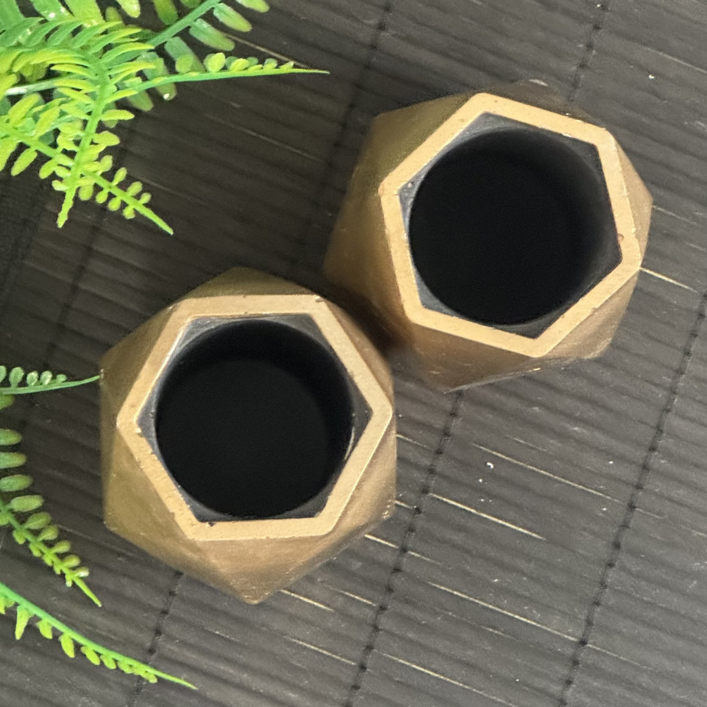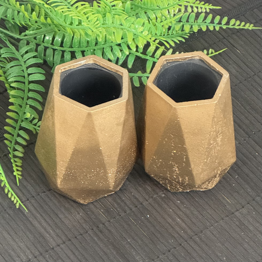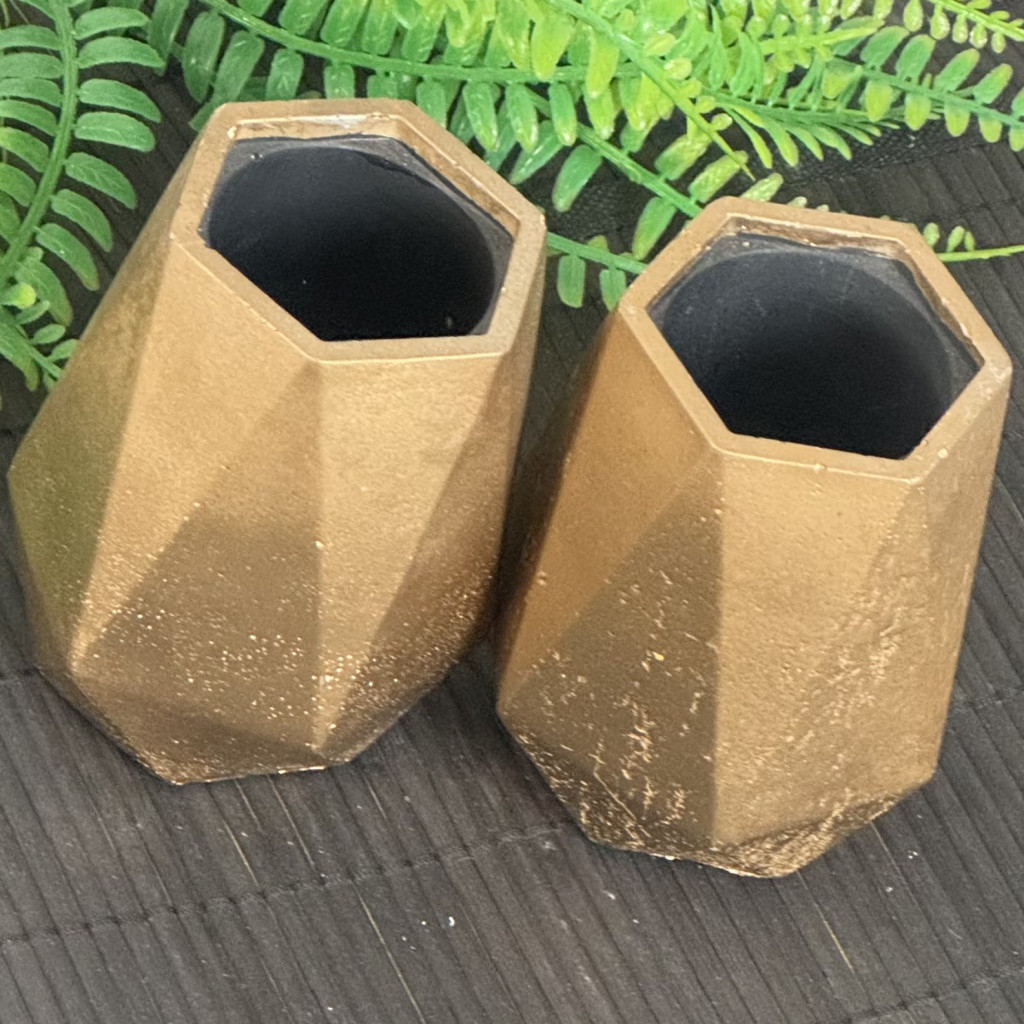 Anyaga beton, külseje matt aranyra festett, belseje fekete. A termék alja karcgátló anyaggal van ellátva.