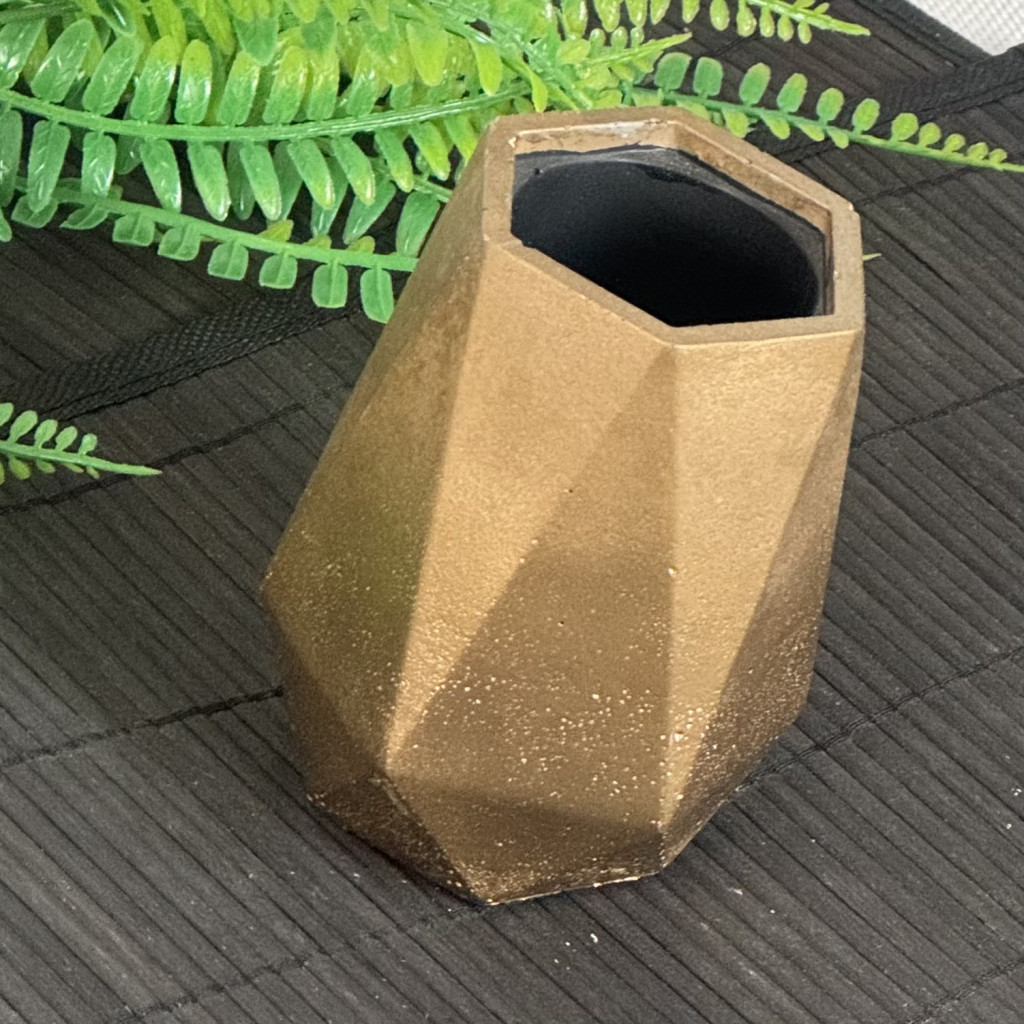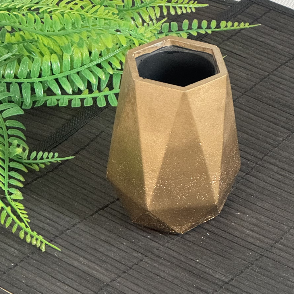 Anyaga beton, külseje matt aranyra festett, belseje fekete. A termék alja karcgátló anyaggal van ellátva.