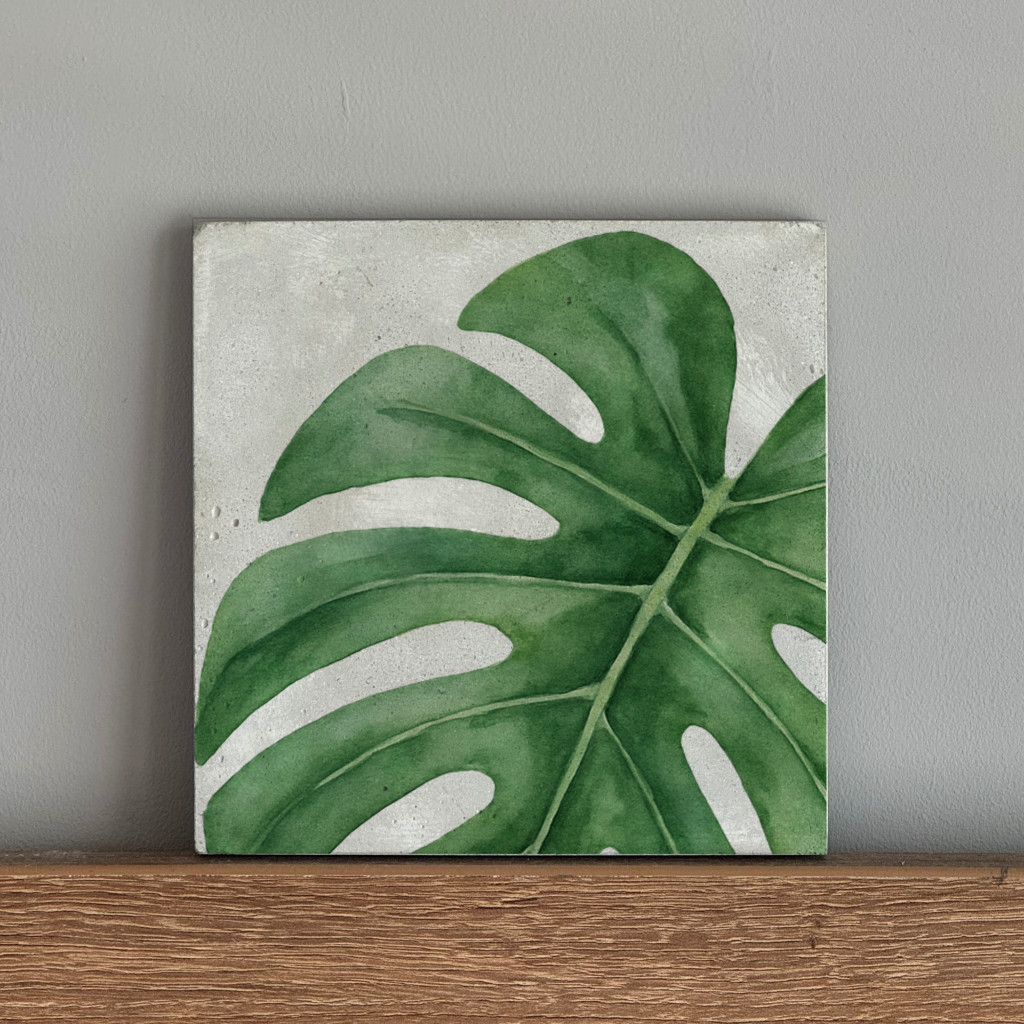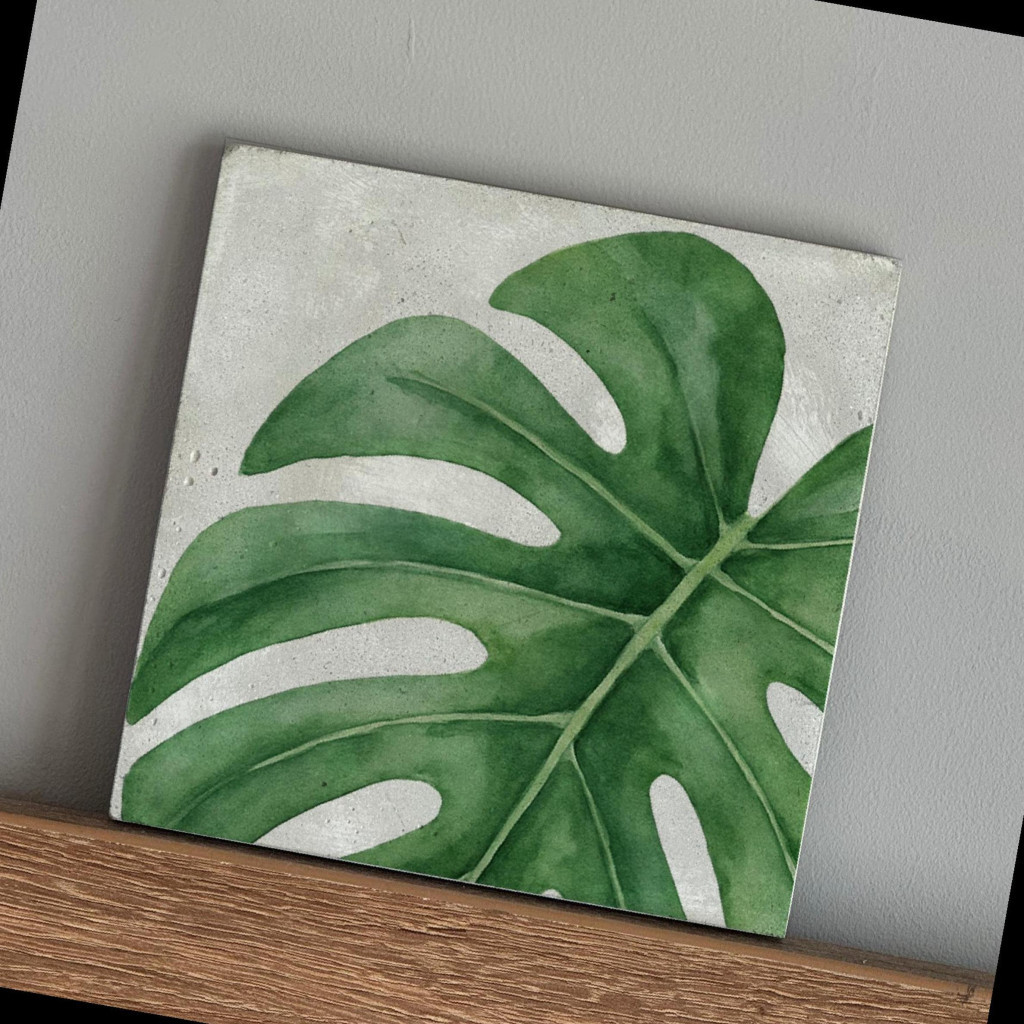 Anyaga beton, felületén zöld színű monstera levél mintájú nyomattal. A termék háta karcgátlóval ellátott.