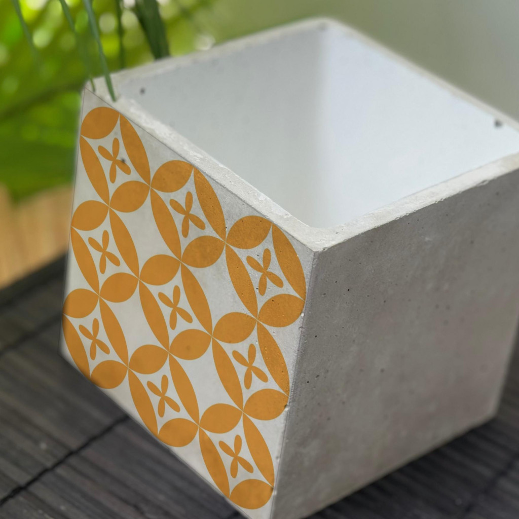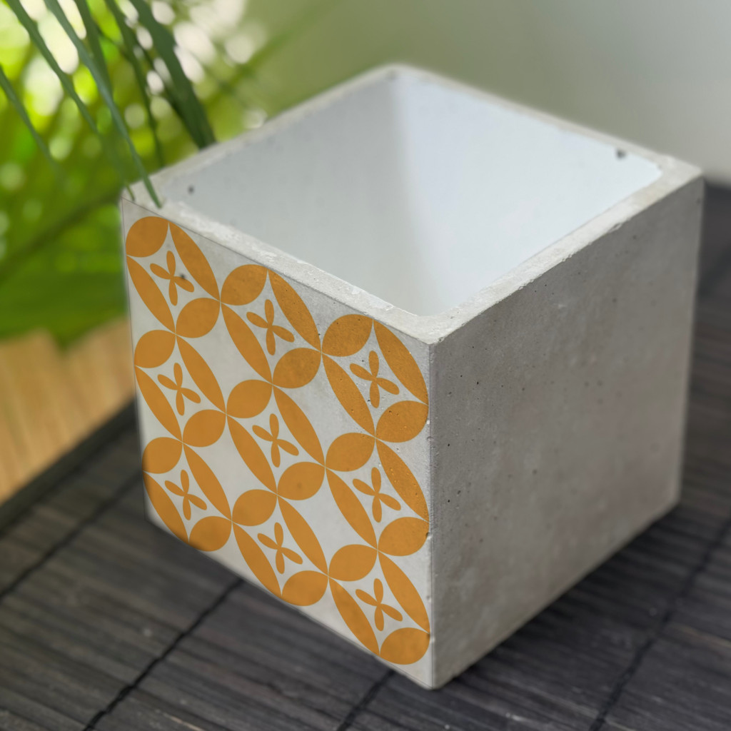 Narancs Csempemintás Beton kaspó 2 - kocka, 2 oldalán mintázott, fehér belsővel