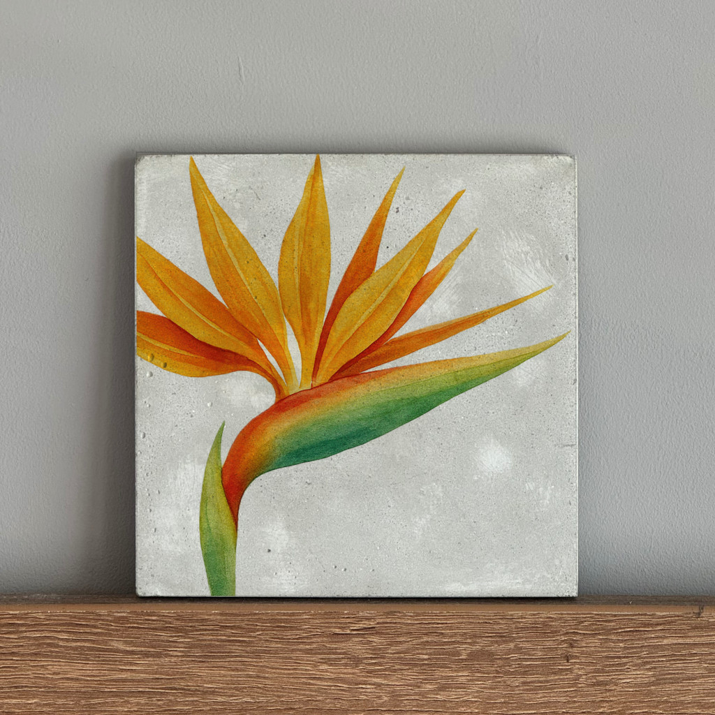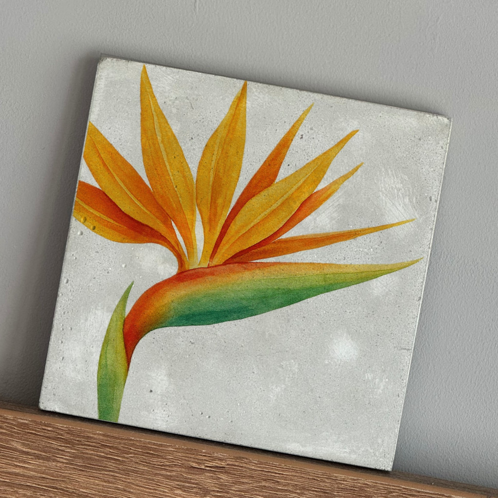 Anyaga beton, felületén papagályvirág mintájú nyomattal. A termék háta karcgátlóval ellátott.