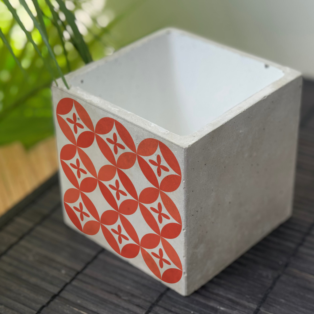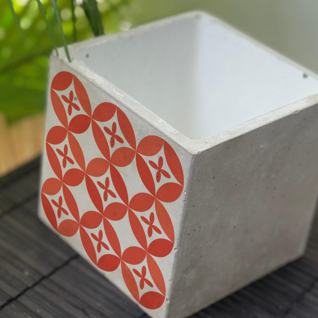 Piros Csempemintás Beton Kaspó - kocka, 2 oldalán mintázott, fehér belsővel