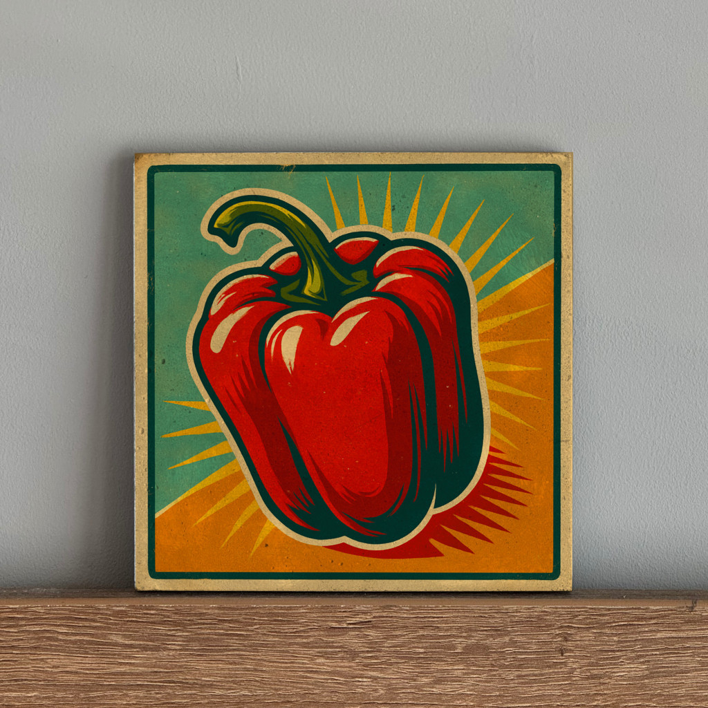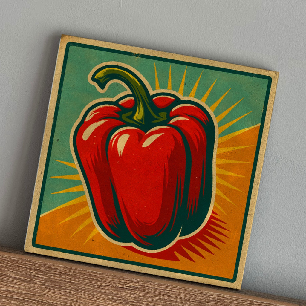 Anyaga beton, felüleltén paprika mintájú nyomattal, retro food tábla stílusban. A termék háta karcgátlóval ellátott.