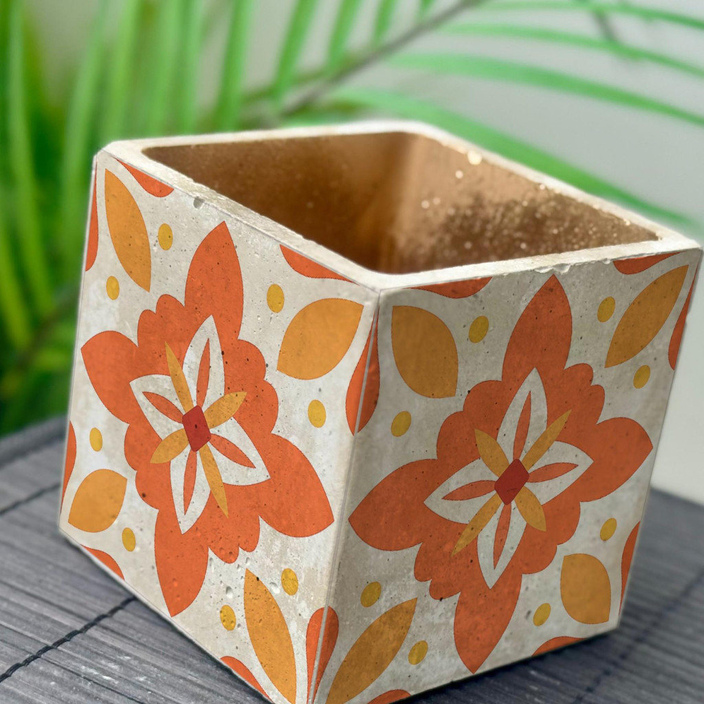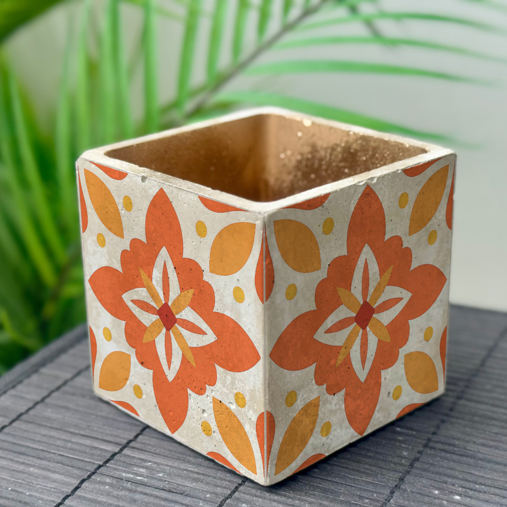 Sárga Csempemintás Beton Kaspó - kocka, 4 oldalán mintázott, aranyozott belsővel