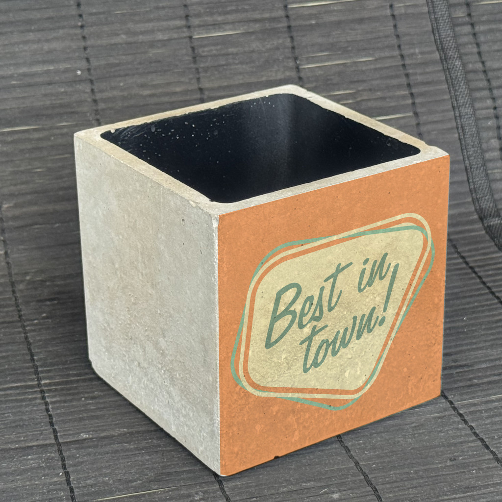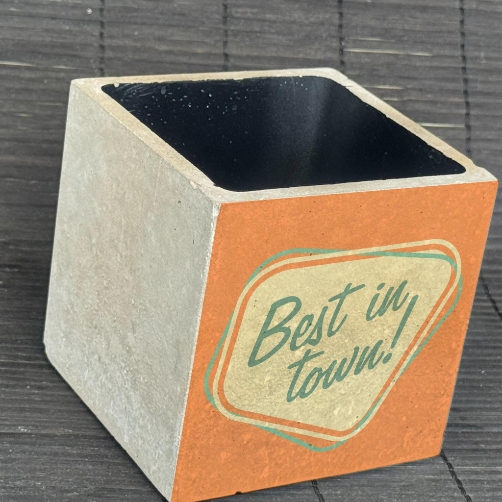 "Best in town" - kocka, 2 oldalán mintázott beton tároló/ evőeszköztartó, fekete belsővel