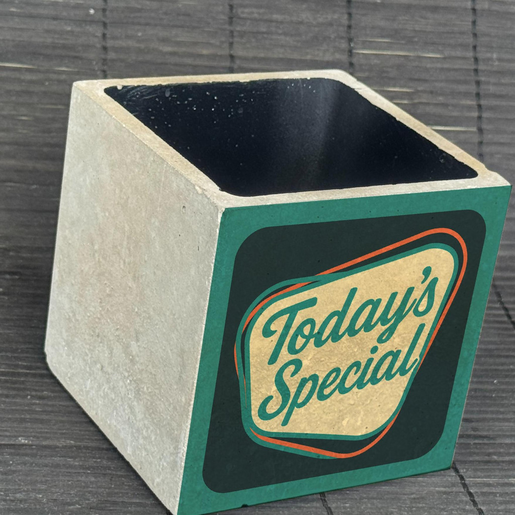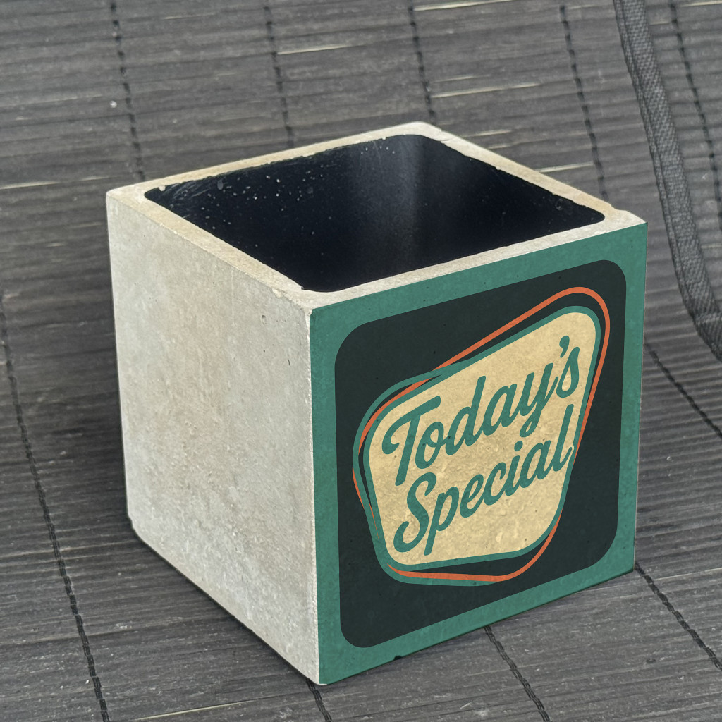 "Today's Special" kaspó - kocka, 2 oldalán mintázott beton tároló/ evőeszköztartó, fekete belsővel