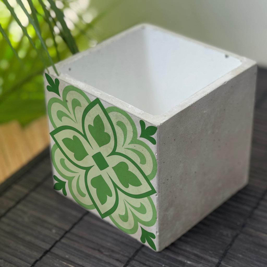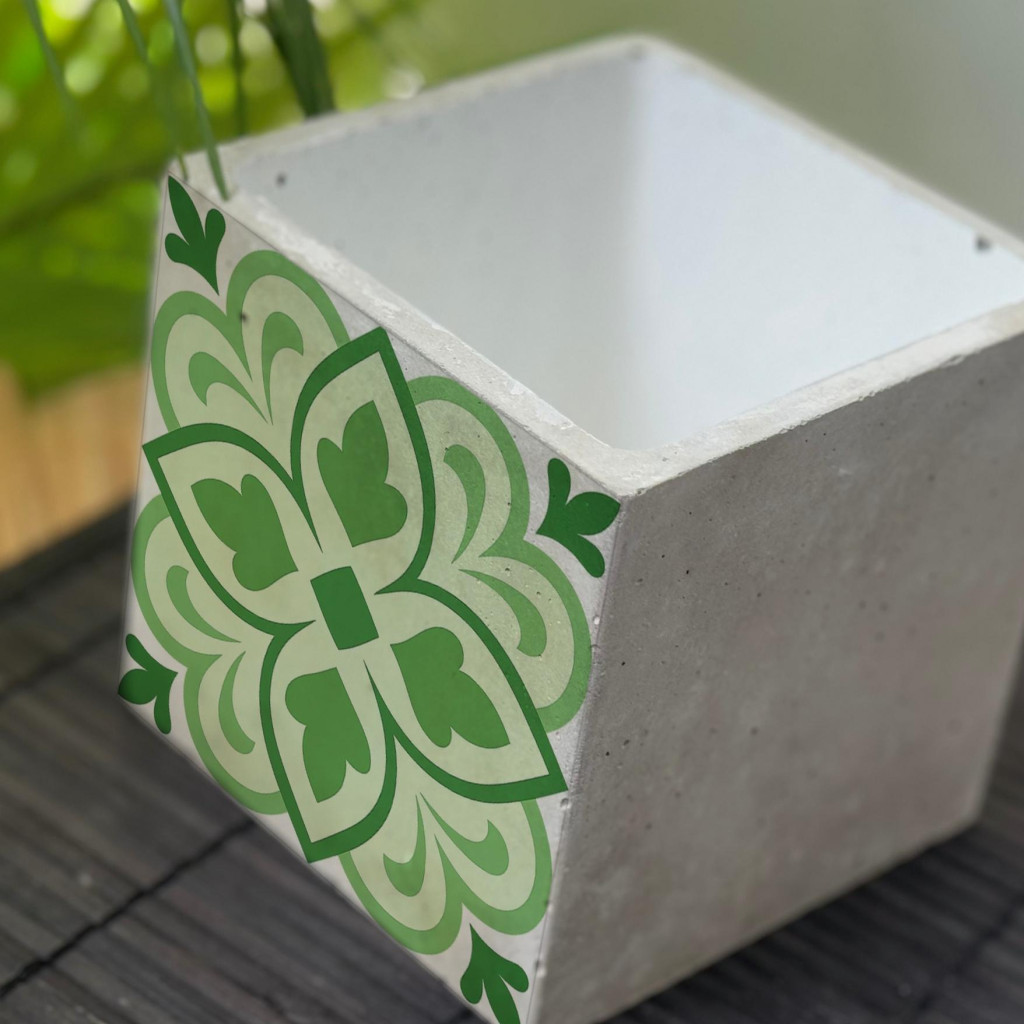 Zöld Csempemintás Beton kaspó 2  - kocka, 2 oldalán mintázott, fehér belsővel