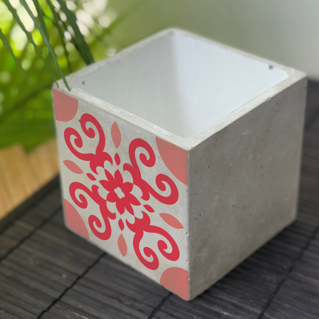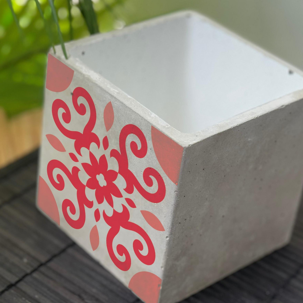 Piros Csempemintás Beton Kaspó - kocka, 2 oldalán mintázott, fehér belsővel