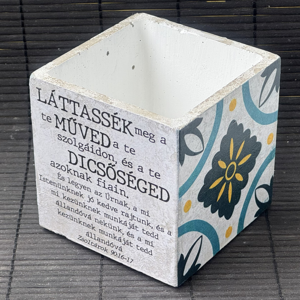 Idézetes, kék csempemintás kaspó - kocka, fehér belsővel v3 - Zsoltárok 90:16-17