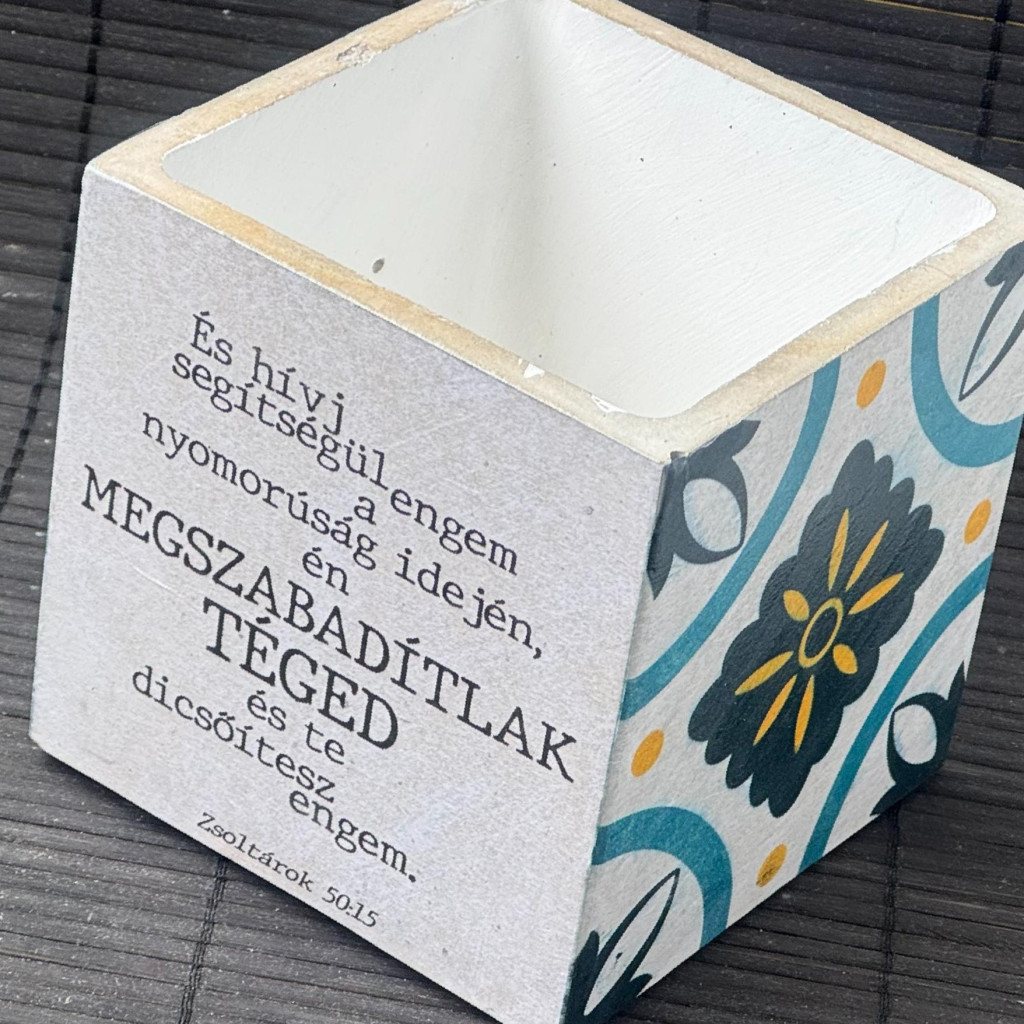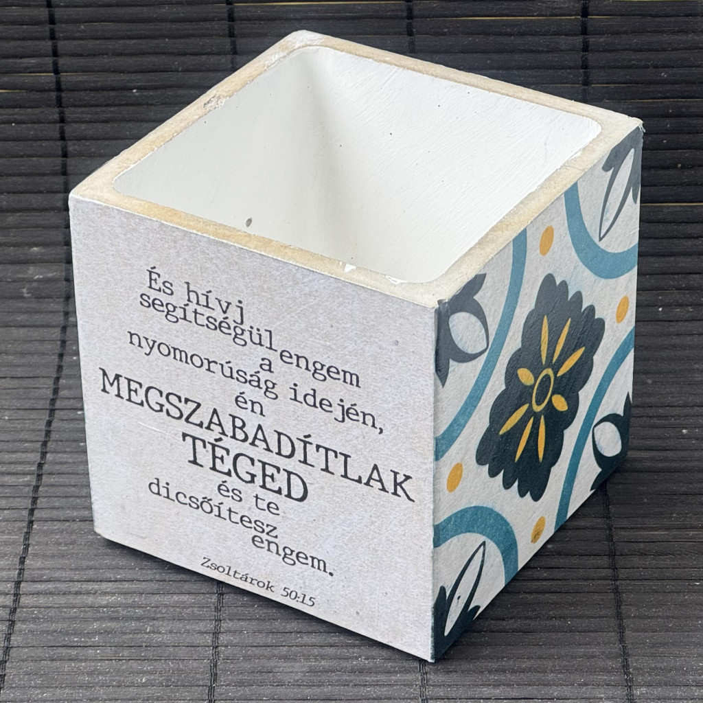 Idézetes, kék csempemintás kaspó - kocka, fehér belsővel v4 - Zsoltárok 50:15