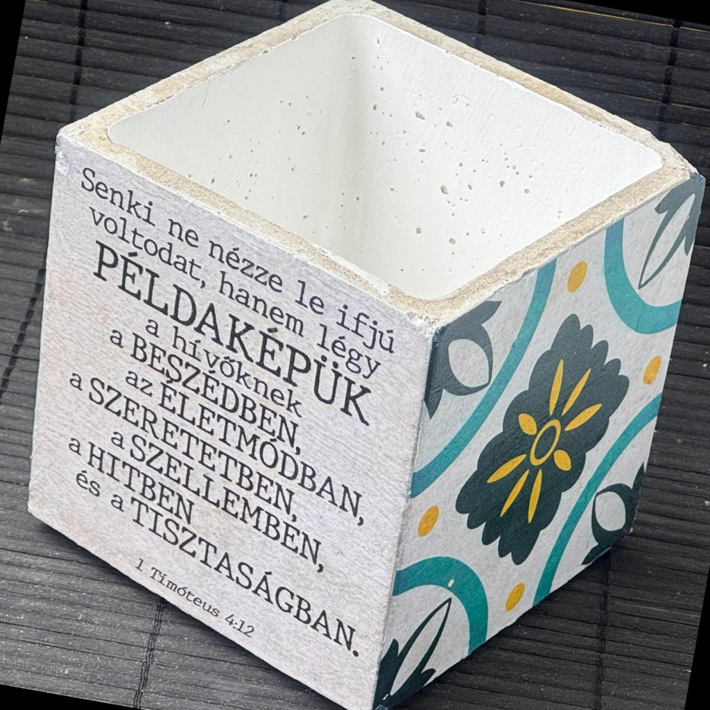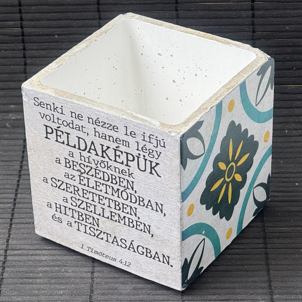 Idézetes, kék csempemintás kaspó - kocka, fehér belsővel v6 - 1 Timóteus 4:12