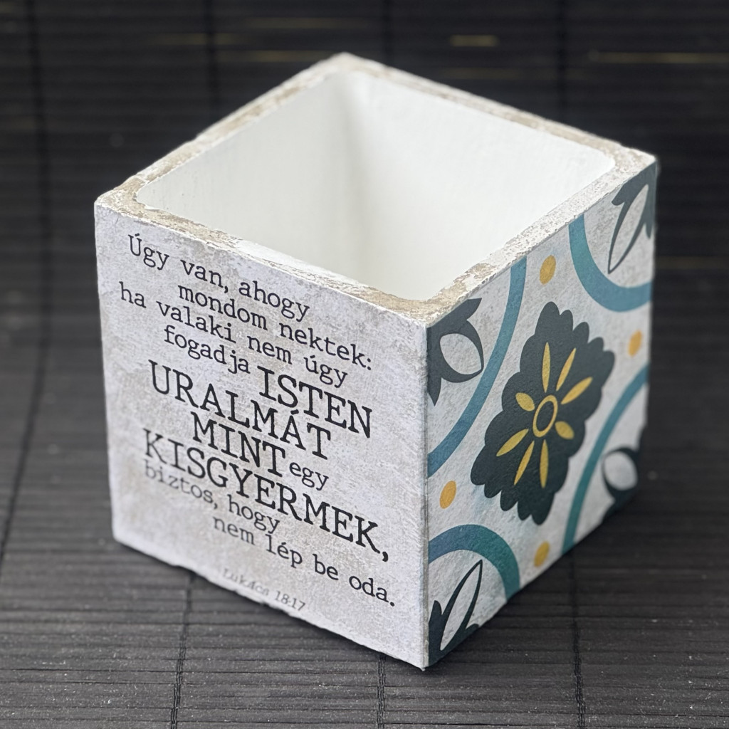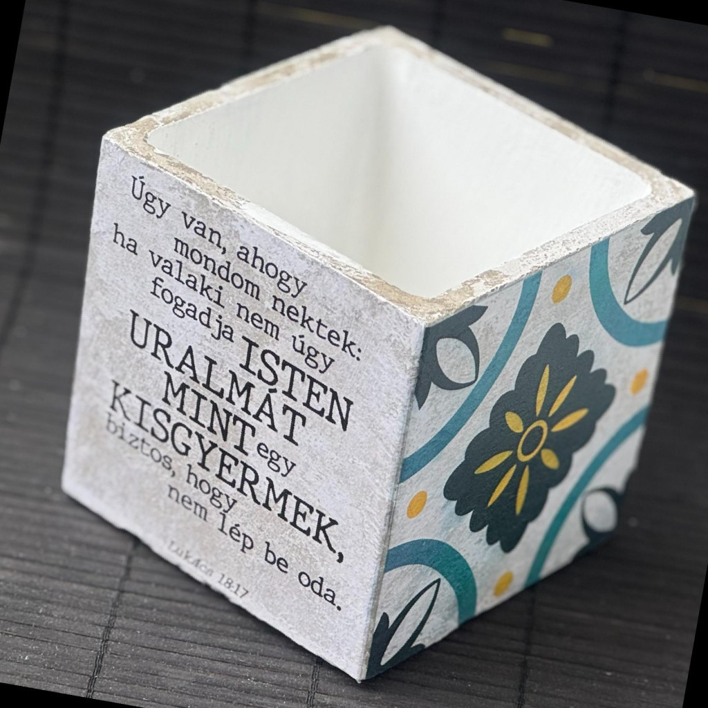 Idézetes, kék csempemintás kaspó - kocka, fehér belsővel v8 - Zsoltárok 8:3