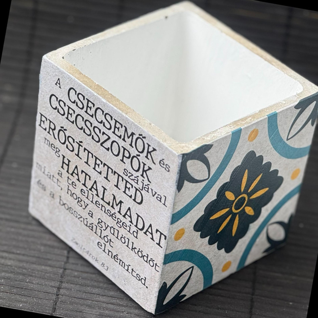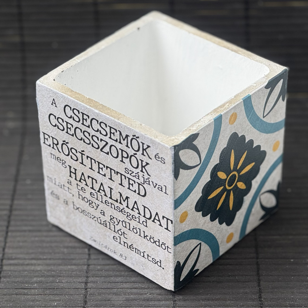 Idézetes, kék csempemintás kaspó - kocka, fehér belsővel v9 - Zsoltárok 34:6