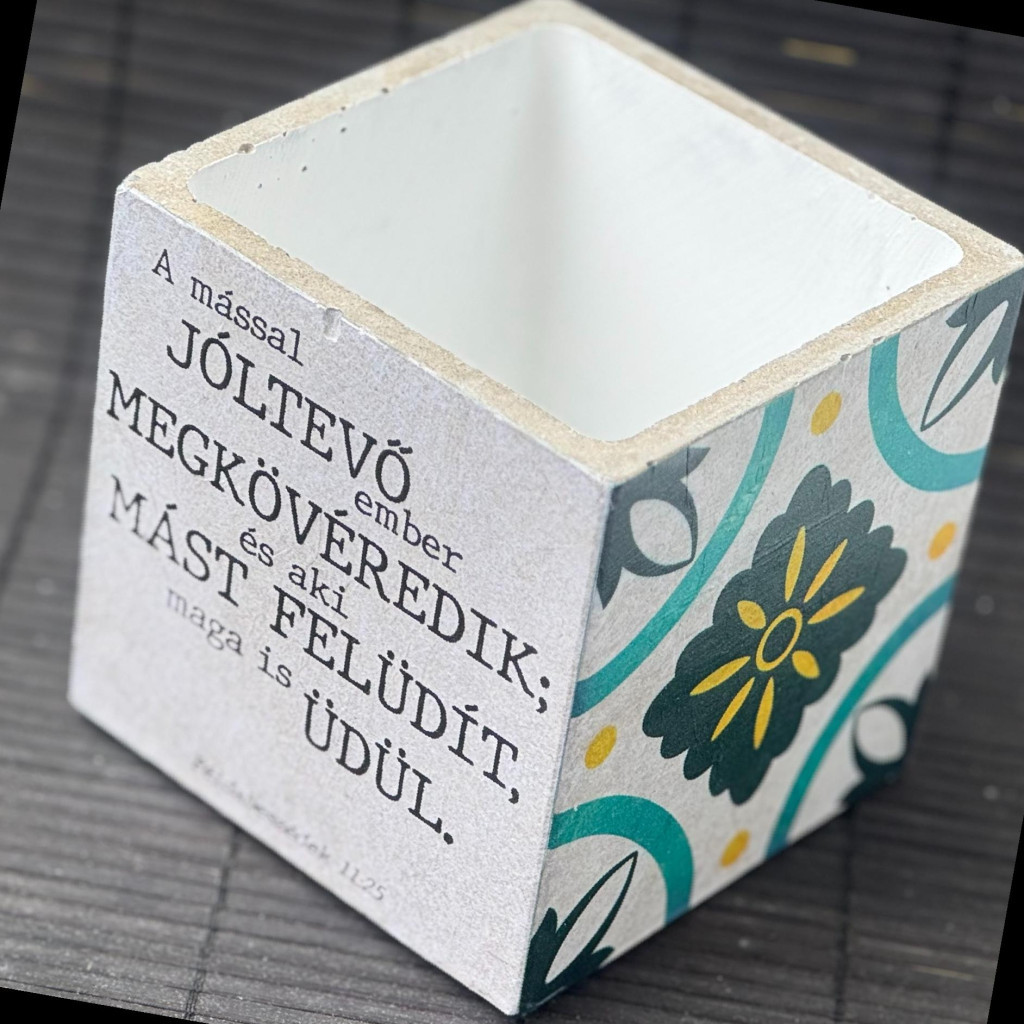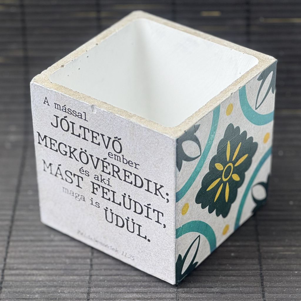 Idézetes, kék csempemintás kaspó - kocka, fehér belsővel v13 - Példabeszédek 11:25