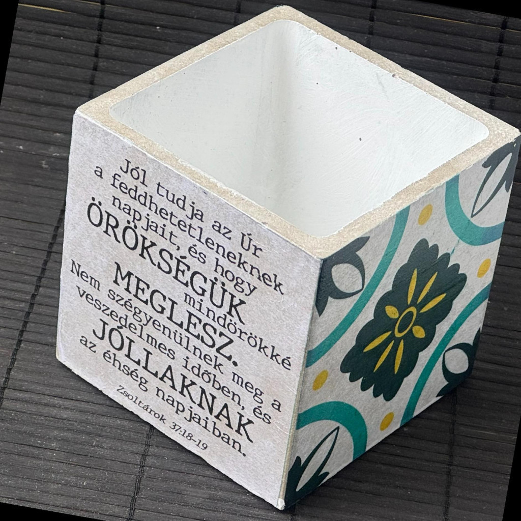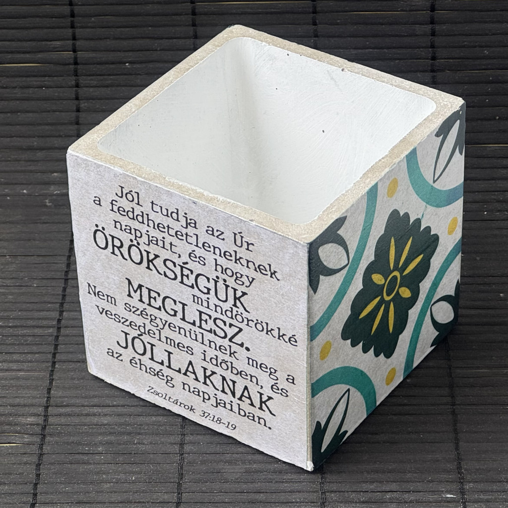 Idézetes, kék csempemintás kaspó - kocka, fehér belsővel v16 - Zsoltárok 37:18-19