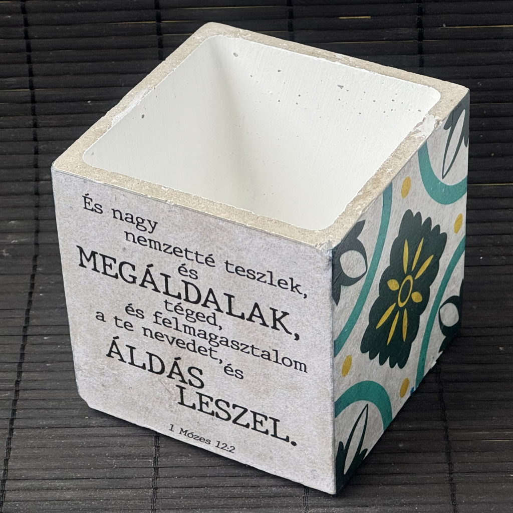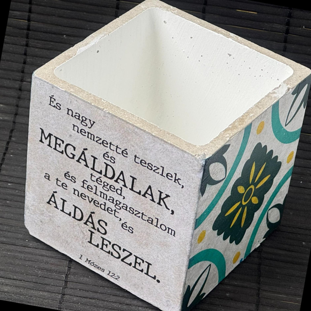 Idézetes, kék csempemintás kaspó - kocka, fehér belsővel v18 - 1 Mózes 12:2